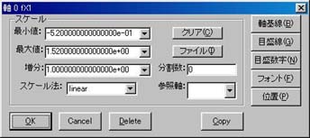 最小値、最大値 軸のスケールの最大と最小。 「最小値」「最大値」「増分」の全てが 0 の時、スケールは未設定状態とみなされ描画時に自動的に設定される。 増分 目盛数字は「増分」の値毎に付けられ、目盛線は「増分」を「分割数」だけ分割した値毎に付けられる。 「スケール法」が log の時、「増分」が10 では 10, 100, 1000 の様に目盛数字が付けられ、 「増分」が 1 の時には 1, 2, 3 の様に目盛数字が付けられる。 スケール法 linear(通常の線形軸), log(対数軸), inverse(逆数軸)から選択。 クリア スケールを未設定状態(「最小値」「最大値」「増分」の全てが 0)にする。 ファイル 指定したデータファイルのデータでスケールを自動設定する。 分割数 「増分」を更に分割する分割数。 参照軸 スケールが未設定状態(「最小値」「最大値」「増分」の全てが 0)の時、ここに指定した軸の設定が代わりに使われる。 軸の通し番号ではなく、実行時に決まる一意の番号(Axis Window の行末に表示される^で始まる数字)で指定するが、コンボボックスのリストには軸の名前で一覧表示される。 軸基線