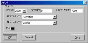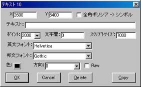 X, Y テキストの左下端(方向0の時)の座標。 全角ギリシア->シンボル ギリシア文字入力のアシスト機能。 日本語全角文字でギリシア文字を入力すると(例えばαβ)、ダイアログボックスを閉じる際に対応するシンボルのアルファベット(例えばab)に自動的に置き換えられる。 フォントの指定は自動で行われないので、手動で「英文フォント」を Symbol (または Sym) にする必要がある。 テキスト 文字列中に制御文字を入れる事で、フォントを文字列単位で変えたりが可能。詳細はテキスト描画の制御文字を参照。 ポイント、文字間 文字のポイント数(0.01pt単位)と文字間のスペース(0.01pt単位)。 スクリプトサイズ 上付き文字、下付き文字を、通常の文字の大きさの何パーセントの大きさにするかを 0.01%単位で指定する。 英文フォント、邦文フォント 使用するフォント。日本語全角文字(2バイト文字)には「邦文フォント」が自動的に使われる。 方向 文字列を描画する方向。0.01度単位。 Raw テキスト描画の制御文字の機能を無効にし、「テキスト」の文字列をそのまま描画する。 ![]()