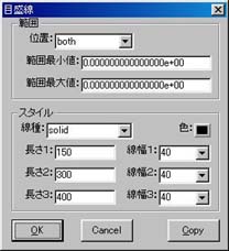 位置 none(目盛線なし), right(軸基線の右回り方向), left(軸基線の左回り方向), both(両側)から選択。 範囲最小値、範囲最大値 目盛線を付ける軸スケールの範囲を指定する。両方共に0の時は、軸全体に目盛が付けられる。 線種 目盛線の種類。 点線の長さ、間隔を詳細に指定するには、"100 10" の様に点線の繰り返し要素の長さを指定する。 色 目盛線の色。 長さ1, 2, 3 目盛線の長さ。目盛線のスケールの細かい方から幅1, 2, 3とする。 線幅1, 2, 3 目盛線の幅。目盛線のスケールの細かい方から幅1, 2, 3とする。 ![]()