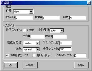 位置 none(目盛線なし), right(軸基線の右回り方向), left(軸基線の左回り方向), both(両側)から選択。 開始点、個数 目盛数字はスケールの「増分」(あるいはその整数倍)毎に付けるが、何番目から付けるかを「開始点」で、 付ける個数を「個数」で指定する。 「開始点」が0で初めから付けられ、「個数」が-1で最後まで付けられる。 間隔 目盛数字をスケールの「増分」の整数倍毎に付ける場合、その整数倍の値。 0で自動設定。 +付加 目盛数字が0または正の値の時、+を必ず追加する。 小数部桁 目盛数字の小数部の桁数。 先頭 各目盛数字の先頭に付ける文字列。 後続 各目盛数字の後続に付ける文字列。 位置合わせ center(中心揃え), left(左揃え), right(右揃え), point(小数点位置揃え)から選択。 方向 目盛数字の文字描画の方向。 平行シフト量 目盛数字の位置を軸基線に平行にずらす。 垂直シフト量 目盛数字の位置を軸基線に垂直にずらす。 ベキ形式(ログ) 対数グラフの目盛数字を 1, 10, 100 とするか 10^0, 10^1, 10^2 とするかの指定。 ゼロ非表示 0の目盛数字を描画しない。X軸-Y軸の (0,0) をまとめて一つの 0 としたい場合に、このオプションを使って 0 を表示しないようにして、手動で 0 を入れる。 自動スケール 目盛数字がここで指定する桁数より大きく(100000の様に)、あるいは小さくなった場合(0.00001の様に)には正規化され、[1x10^5] の様な凡例が軸に付けられる。 ![]()