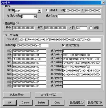 種類 フィッティングの種類。poly(多項式), pow(ベキ y=a*x^b), exp(指数 y=exp(a*x+b)), log(ログ y=a*log(x)+b), user(ユーザ定義式によるフィット)から選択。 多項式次元 種類がpolyの時の多項式の次数。 通過点 チェックすると「X, Y」に指定した点を通る条件付きでフィットが行われる。 種類が user に場合に、このオプションは指定できない。 重み付け データに重み付けをしてフィットする。 数式変換と同様の関数が使用できるが、 カラムの生データの変数 %00-%99 や、メモリ関数、差分積算関数等は使用できない。 データファイルの変換式が指定してある場合には、変数X, Yには生データでは無く変換後のデータが入っている。 通常のフィットは、重み付け 1 に対応する。 最小、最大、分割 フィット結果の描画法を設定する。 フィット結果式のXの値を、「最小」から「最大」までを「分割」数だけ分割して評価して Y の値を求めて直線で結ぶ。 「最大」「最小」が共に 0 の時は X 軸の最小と最大が用いられる。 補間 チェックしてある場合、フィット結果は直線の集まりではなく、スプライン補間して曲線で描画される。 フィット式 種類が user の時にフィットに用いられる式。 %01から%09までがフィットで求められるパラメターとなる。 収束 種類が user の時、収束条件を % で指定する。デフォルトでは 1% なので、フィット結果は1/100 の精度となる。 微分式指定 チェックしてある場合、微分式を使ってパラメター微分の値を計算する。 チェックしていない場合、数値的にパラメター微分の近似値を計算する。 %00-%09 種類が user の場合にはフィッティングパラメターは繰り返し処理で求められるが、その繰り返し処理の初期値を指定する。 フィット関数によっては、フィッティング結果に近い値を入れないと収束しない。 dF/d(%00)-dF/d(%09) フィット式をフィッティングパラメター%00-%09で偏微分した式。 「微分式指定」をチェックした場合に指定する必要がある。 結果表示 フィット結果を表示する。 クリップボード フィット結果をクリップボードにコピーする。 Copy 他のデータファイルのフィット設定を取り込む。 設定読込 保存してあるフィット設定を読み込む。 設定保存 現在のフィット設定を保存する。後で読み込む際に区別がつくように「プロファイル」を指定する。 設定は _fit.ngp の名前のファイルに保存される。