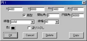 X, Y, RX, RY 円の中心座標(X,Y) とX方向半径 RX, Y方向半径 RY。 扇形 塗りつぶしを行う際、円の中心を円弧の端を結んだ扇形として塗りつぶす。 開始角、円弧角 円弧は「開始角」から反時計回りに「円弧角」だけ描画される。0.01度単位。 塗りつぶし 扇形または弦形として塗りつぶす。 ![]()