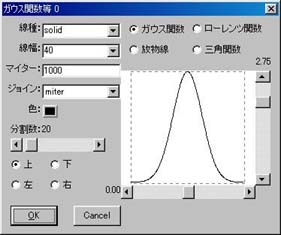 ガウス関数、ローレンツ関数、放物線、三角関数。 選択した関数形をもつレジェンド「曲線」を生成する。ダイアログボックスを閉じた時点で「曲線」に展開される。 分割数 曲線に展開する際に、関数形を何分割するかを指定。 上、下、左、右 関数形の方向。 スライダ 関数形を変更する。 ![]()