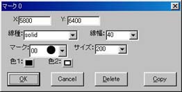 X, Y マークの中心座標。 マーク マークの種類。 サイズ マークのサイズ。 色1, 色2 マークの第一色「色1」と第二色「色2」。 ![]()