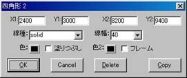 X1, Y1, X2, Y2 四角形の座標。 塗りつぶし 四角形の内部を「色」で塗りつぶす。 色2, フレーム フレームがチェックされている時、四角形のフレームを「色2」で描画。 ![]()