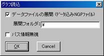 データの展開 データファイルや合成ファイルを含めた形でセーブした NGP ファイルを読む際に、それらファイルを展開する。 展開フォルダ 「データの展開」によってファイルを展開するフォルダ。デフォルトはカレントフォルダ(.\)。 パス情報無視 データファイルや合成ファイルのパス情報(フォルダ名)を無視し、それらファイルがカレントフォルダにあるものとして取り扱う。 ![]()