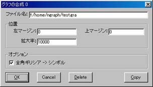 ファイル名 GRAファイル(*.GRA)のファイル名を指定する。 左マージン、上マージン 合成ファイルを合成する位置。 拡大率 合成ファイルを拡大、縮小して合成する際の拡大率。0.01%単位。 全角ギリシア->シンボル Ngraph ver 5.4 以前の GRA ファイルを合成する際、全角ギリシア文字をSymbolフォントへと自動変換する。