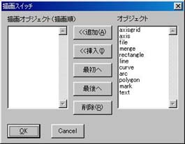 描画オブジェクト(描画順) このリストボックスに指定されたグラフィックスオブジェクトが、その順番で描画が行われる。 空白の場合はデフォルトの描画順(右の「オブジェクト」リストの順)で全てのオブジェクトが描画される。 追加、挿入 右の「オブジェクト」リストで選択されているオブジェクトが、「描画オブジェクト(描画順)」のリストに追加、挿入される。 最初へ、最後へ 「描画オブジェクト(描画順)」のリストで選択されているオブジェクトの順番を変更して最初、最後に移動する。
