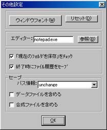 ウィンドウフォント、リセット Data Window 等に表示される文字のフォント。リセットでデフォルトに戻す。 エディター データダイアログボックスの「Edit」、Data Window のポップアップメニューの「Edit」で、データファイルを編集するために起動されるエディター。 「現在のフォルダを保存」をチェック ファイルを選択するダイアログボックスを開いた時、「現在のフォルダ開く」が初期状態でチェックされているようにする。 終了時にファイル履歴をセーブ グラフファイル(NGPファイル)の履歴とデータファイルの履歴(それぞれ、[グラフ]メニュー、[データ]メニューの下側にリストされる)を終了時に保存する。 パス情報、データファイルを含める、合成ファイルを含める 「グラフの保存」ダイアログボックスの初期状態を決める。