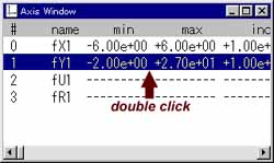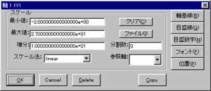 軸ダイアログボックスを開く方法は他にも用意されています。この様にすると下図の軸ダイアログボックスが開かれます。 ここで、「最小値」「最大値」「増分」に軸のスケ−ルの最小,最大,増分を指定してください。 目盛数字は増分に対して付けられます。 「分割数」は「増分」をさらに何等分して目盛線を引くかを決めます。 この値が0の時は自動的に分割数が決められます。 「スケール法」では通常の線形軸(linear)、ログ(log)、逆数(inverse)の中から1つを選ぶ事ができます。 「ファイル」ボタンを押すとスケールを開いたデータファイル中から指定したファイルでオ−トスケ−ルを行って決める事ができます。
