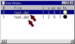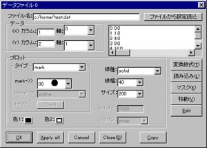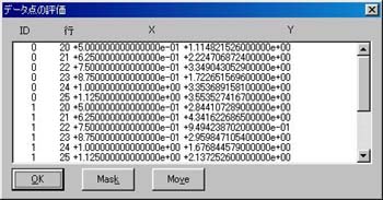 ここでリストアップされた項目の「ID」はデータファイルの番号、 「行」はそのファイル中の行数、「X、Y」が座標値を示してします。 リストボックスの中の項目を選択し「Mask」ボタンを押す事で、データの一部だけを描かなくすることができます。また、「Move」ボタンを押すと、データを移動させる事もできます。 これらマスク、移動の解除はデータダイアログボックスの「マスク」「移動」で行います。![]()