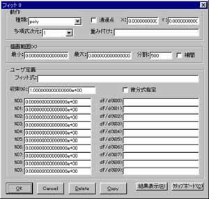 dF/d(%00): (X+%01)^2としてください。 「微分式指定」をチェックしなければ、微分式の近似値を数値的に求めますが、明示的に微分式を指定した方が収束は速くなります。 また、フィットパラメタ−の初期値を「%00:〜%09:」で指定してください。 パラメタ−の値が変わらなくなった時を収束したと判断していますが、全く変化しなくなる事はありません。 変化しなくなったと見なす基準を「収束(%):」で指定します。 デフォルトでは 1% ですのでフィット結果の有効桁数は2桁です。